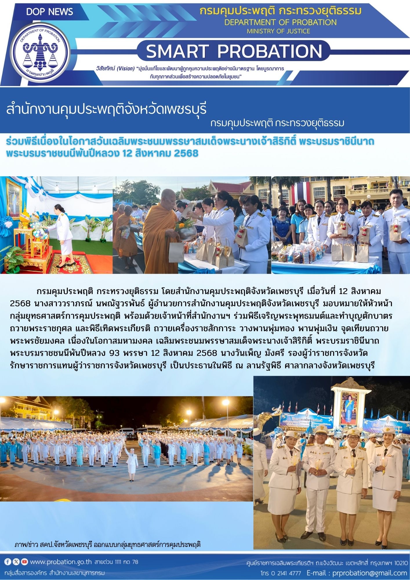กรมคุมประพฤติ กระทรวงยุติธรรม โดยสำนักงานคุมประพฤติจังหวัดเพชรบุรี เมื่อวันที่ 12 สิงหาคม 2568 นางสาววราภรณ์ นพณัฐวรพันธ์ ผู้อำนวยการสำนักงานคุมประพฤติจังหวัดเพชรบุรี มอบหมายให้หัวหน้ากลุ่มยุทธศาสตร์การคุมประพฤติ พร้อมด้วยเจ้าหน้าที่สำนักงานฯ ร่วมพิธีเจริญพระพุทธมนต์และทำบุญตักบาตรถวายพระราชกุศล และพิธีเทิดพระเกียรติ ถวายเครื่องราชสักการะ วางพานพุ่มทอง พานพุ่มเงิน จุดเทียนถวายพระพรชัยมงคล เนื่องในโอกาสมหามงคล เฉลิมพระชนมพรรษาสมเด็จพระนางเจ้าสิริกิติ์ พระบรมราชินีนาถ พระบรมราชชนนีพันปีหลวง 93 พรรษา 12 สิงหาคม 2568 นางวันเพ็ญ มังศรี รองผู้ว่าราชการจังหวัด รักษาราชการแทนผู้ว่าราชการจังหวัดเพชรบุรี เป็นประธานในพิธี ณ ลานรัฐพิธี ศาลากลางจังหวัดเพชรบุรี