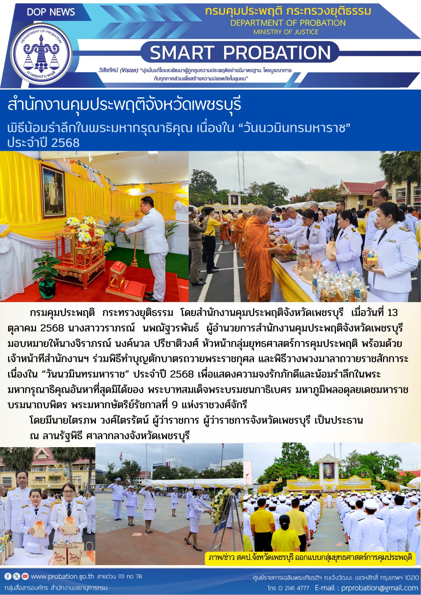 เมื่อวันที่ 13 ตุลาคม 2568 นางสาววราภรณ์ นพณัฐวรพันธ์ ผู้อำนวยการสำนักงานคุมประพฤติจังหวัดเพชรบุรี มอบหมายให้นางจิราภรณ์ นงค์นวล ปรีชาติวงศ์ หัวหน้ากลุ่มยุทธศาสตร์การคุมประพฤติ พร้อมด้วยเจ้าหน้าทีสำนักงานฯ ร่วมพิธีทำบุญตักบาตรถวายพระราชกุศล และพิธีวางพวงมาลาถวายราชสักการะ เนื่องใน "วันนวมินทรมหาราช" ประจำปี 2568 เพื่อแสดงความจงรักภักดีและน้อมรำลึกในพระมหากรุณาธิคุณอันหาที่สุดมิได้ของ พระบาทสมเด็จพระบรมชนกาธิเบศร มหาภูมิพลอดุลยเดชมหาราช บรมนาถบพิตร พระมหากษัตริย์รัชกาลที่ 9 แห่งราชวงศ์จักรี