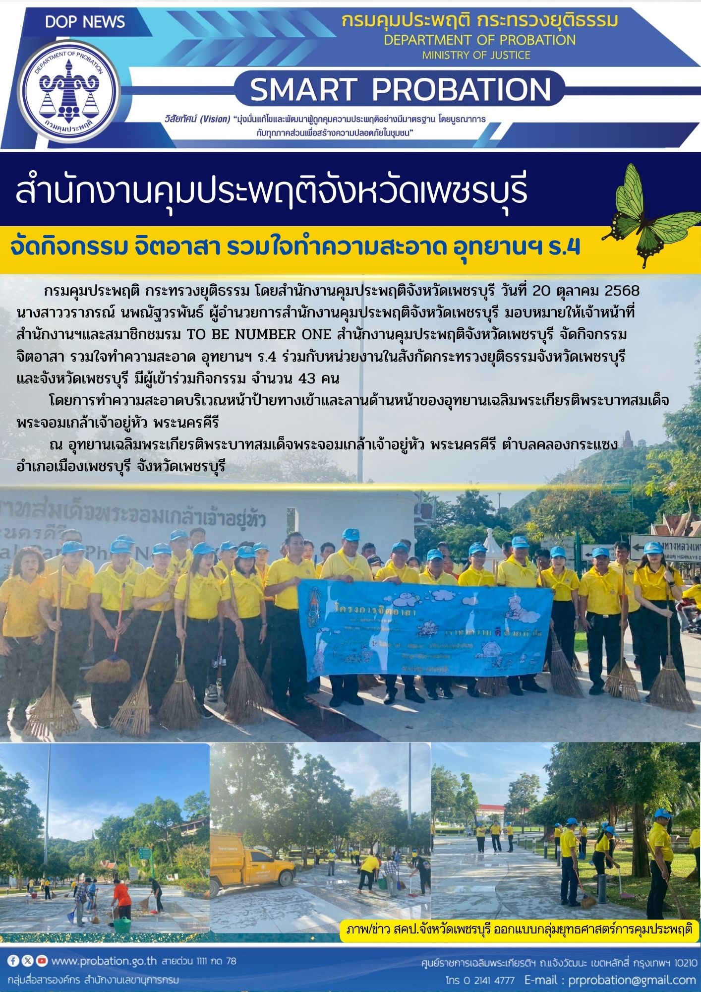 วันที่ 20 ตุลาคม 2568 นางสาววราภรณ์ นพณัฐวรพันธ์ ผู้อำนวยการสำนักงานคุมประพฤติจังหวัดเพชรบุรี มอบหมายให้เจ้าหน้าที่สำนักงานฯและสมาชิกชมรม TO BE NUMBER ONE สำนักงานคุมประพฤติจังหวัดเพชรบุรี จัดกิจกรรม จิตอาสา รวมใจทำความสะอาด อุทยานฯ ร.4 ร่วมกับหน่วยงานในสังกัดกระทรวงยุติธรรมจังหวัดเพชรบุรี และจังหวัดเพชรบุรี มีผู้เข้าร่วมกิจกรรม จำนวน 43 คน โดยการทำความสะอาดบริเวณหน้าป้ายทางเข้าและลานด้านหน้าของอุทยานเฉลิมพระเกียรติพระบาทสมเด็จพระจอมเกล้าเจ้าอยู่หัว พระนครคีรี ณ อุทยานเฉลิมพระเกียรติพระบาทสมเด็จพระจอมเกล้าเจ้าอยู่หัว พระนครคีรี ตำบลคลองกระแซงอำเภอเมืองเพชรบุรี จังหวัดเพชรบุรี