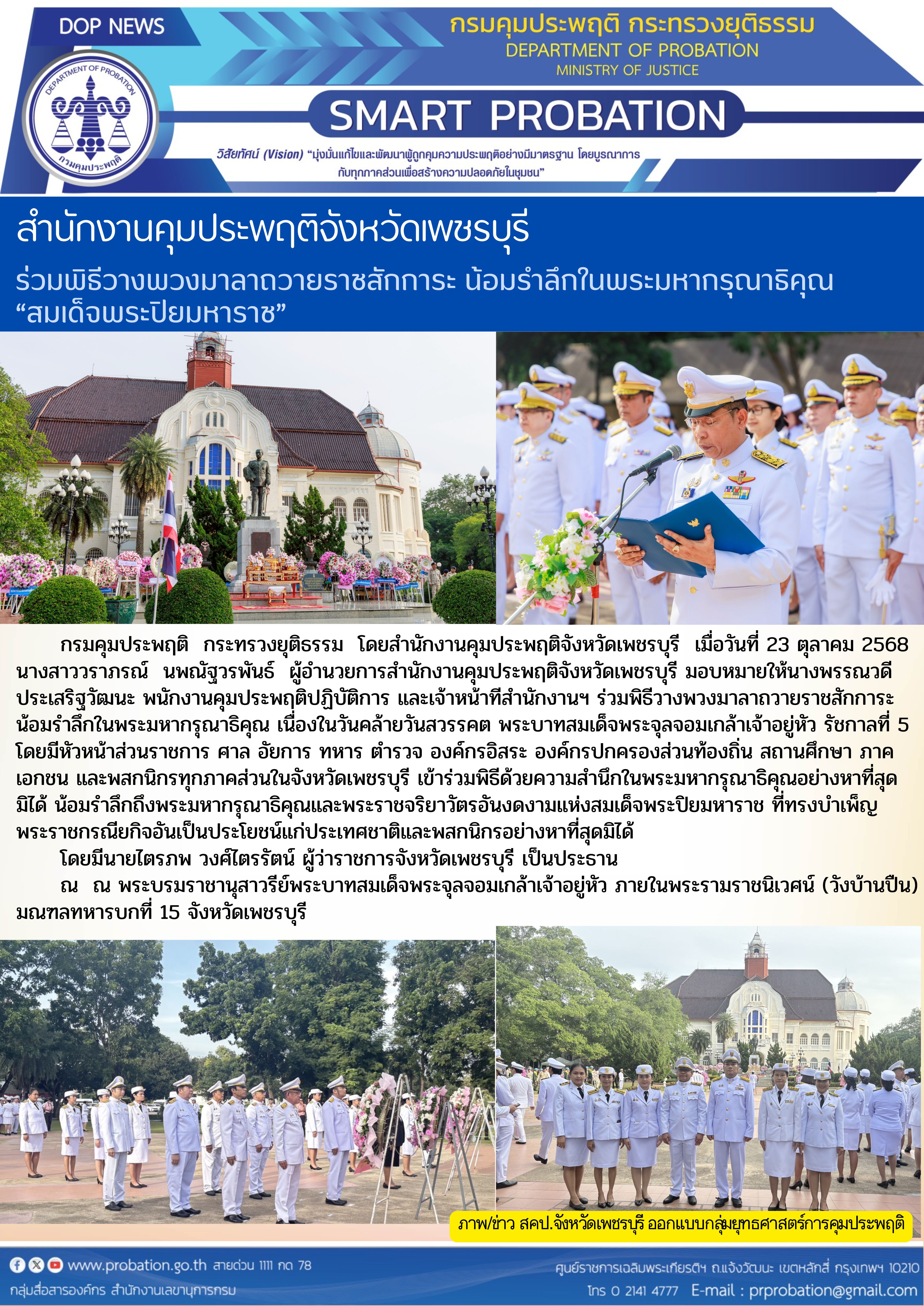 กรมคุมประพฤติ กระทรวงยุติธรรม โดยสำนักงานคุมประพฤติจังหวัดเพชรบุรี เมื่อวันที่ 23 ตุลาคม 2568 นางสาววราภรณ์ นพณัฐวรพันธ์ ผู้อำนวยการสำนักงานคุมประพฤติจังหวัดเพชรบุรี มอบหมายให้นางพรรณวดี ประเสริฐวัฒนะ พนักงานคุมประพฤติปฏิบัติการ และเจ้าหน้าทีสำนักงานฯ ร่วมพิธีวางพวงมาลาถวายราชสักการะน้อมรำลึกในพระมหากรุณาธิคุณ เนื่องในวันคล้ายวันสวรรคต พระบาทสมเด็จพระจุลจอมเกล้าเจ้าอยู่หัว รัชกาลที่ 5 โดยมีหัวหน้าส่วนราชการ ศาล อัยการ ทหาร ตำรวจ องค์กรอิสระ องค์กรปกครองส่วนท้องถิ่น สถานศึกษา ภาคเอกชน และพสกนิกรทุกภาคส่วนในจังหวัดเพชรบุรี เข้าร่วมพิธีด้วยความสำนึกในพระมหากรุณาธิคุณอย่างหาที่สุดมิได้ น้อมรำลึกถึงพระมหากรุณาธิคุณและพระราชจริยาวัตรอันงดงามแห่งสมเด็จพระปิยมหาราช ที่ทรงบำเพ็ญพระราชกรณียกิจอันเป็นประโยชน์แก่ประเทศชาติและพสกนิกรอย่างหาที่สุดมิได้ โดยมีนายไตรภพ วงศ์ไตรรัตน์ ผู้ว่าราชการจังหวัดเพชรบุรี เป็นประธาน ณ พระบรมราชานุสาวรีย์พระบาทสมเด็จพระจุลจอมเกล้าเจ้าอยู่หัว ภายในพระรามราชนิเวศน์ (วังบ้านปืน) มณฑลทหารบกที่ 15 จังหวัดเพชรบุรี