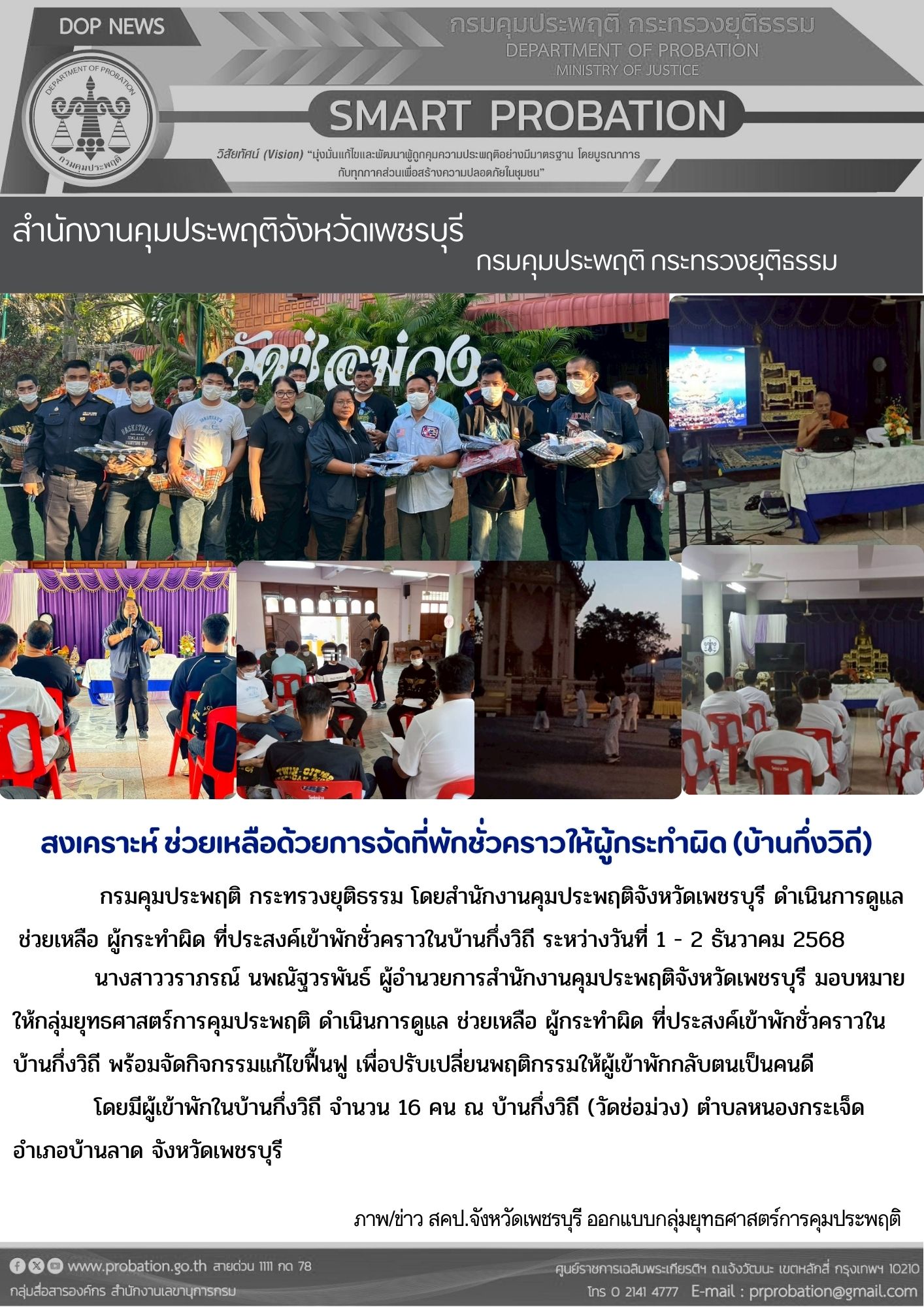 นางสาววราภรณ์ นพณัฐวรพันธ์ ผู้อำนวยการสำนักงานคุมประพฤติจังหวัดเพชรบุรี มอบหมายให้กลุ่มยุทธศาสตร์การคุมประพฤติ ดำเนินการดูแล ช่วยเหลือ ผู้กระทำผิด ที่ประสงค์เข้าพักชั่วคราวในบ้านกึ่งวิถี พร้อมจัดกิจกรรมแก้ไขฟื้นฟู เพื่อปรับเปลี่ยนพฤติกรรมให้ผู้เข้าพักกลับตนเป็นคนดี โดยมีผู้เข้าพักในบ้านกึ่งวิถี จำนวน 16 คน ณ บ้านกึ่งวิถี (วัดช่อม่วง) ตำบลหนองกระเจ็ด อำเภอบ้านลาด จังหวัดเพชรบุรี