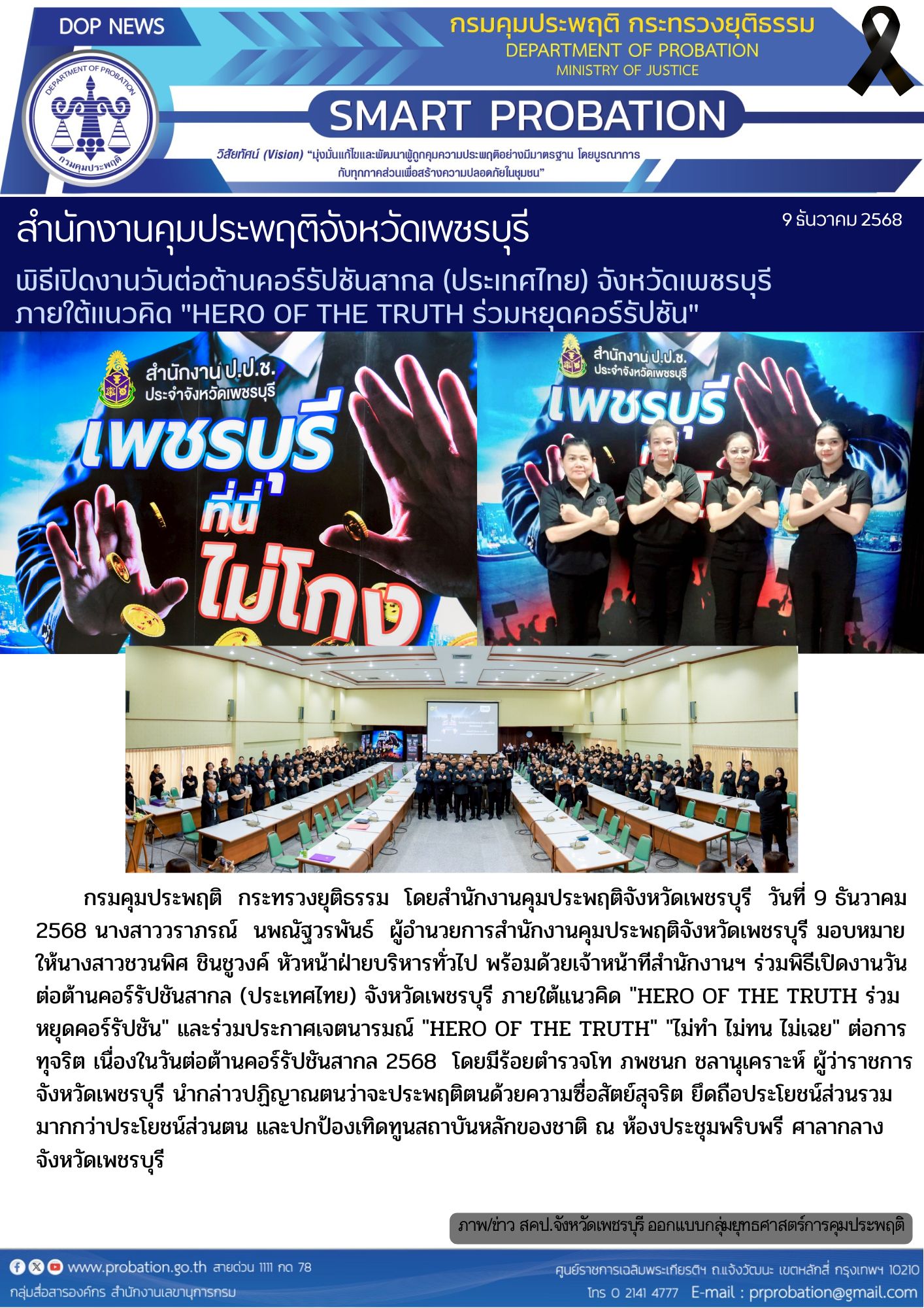 วันที่ 9 ธันวาคม 2568 นางสาววราภรณ์ นพณัฐวรพันธ์ ผู้อำนวยการสำนักงานคุมประพฤติจังหวัดเพชรบุรี มอบหมายให้นางสาวชวนพิศ ชินชูวงค์ หัวหน้าฝ่ายบริหารทั่วไป พร้อมด้วยเจ้าหน้าทีสำนักงานฯ ร่วมพิธีเปิดงานวันต่อต้านคอร์รัปชันสากล (ประเทศไทย) จังหวัดเพชรบุรี ภายใต้แนวคิด "HERO OF THE TRUTH ร่วมหยุดคอร์รัปชัน" และร่วมประกาศเจตนารมณ์ "HERO OF THE TRUTH" "ไม่ทำ ไม่ทน ไม่เฉย" ต่อการทุจริต เนื่องในวันต่อต้านคอร์รัปชันสากล 2568 โดยมีร้อยตำรวจโท ภพชนก ชลานุเคราะห์ ผู้ว่าราชการจังหวัดเพชรบุรี นำกล่าวปฏิญาณตนว่าจะประพฤติตนด้วยความซื่อสัตย์สุจริต ยึดถือประโยชน์ส่วนรวมมากกว่าประโยชน์ส่วนตน และปกป้องเทิดทูนสถาบันหลักของชาติ ณ ห้องประชุมพริบพรี ศาลากลางจังหวัดเพชรบุรี