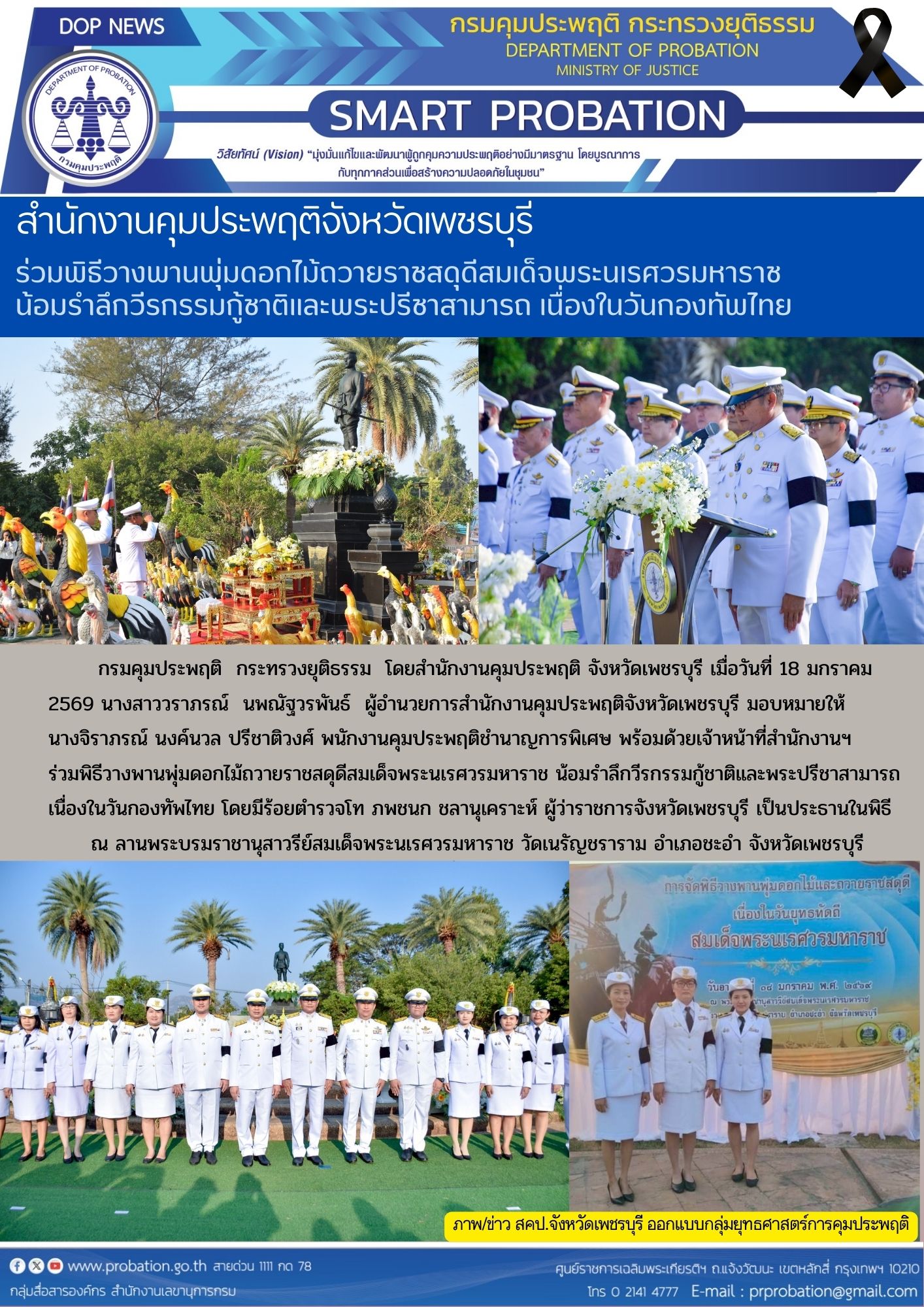 กรมคุมประพฤติ กระทรวงยุติธรรม โดยสำนักงานคุมประพฤติ จังหวัดเพชรบุรี เมื่อวันที่ 18 มกราคม 2569 นางสาววราภรณ์ นพณัฐวรพันธ์ ผู้อำนวยการสำนักงานคุมประพฤติจังหวัดเพชรบุรี มอบหมายให้นางจิราภรณ์ นงค์นวล ปรีชาติวงศ์ พนักงานคุมประพฤติชำนาญการพิเศษ พร้อมด้วยเจ้าหน้าที่สำนักงานฯ ร่วมพิธีวางพานพุ่มดอกไม้ถวายราชสดุดีสมเด็จพระนเรศวรมหาราช น้อมรำลึกวีรกรรมกู้ชาติและพระปรีชาสามารถ เนื่องในวันกองทัพไทย โดยมีร้อยตำรวจโท ภพชนก ชลานุเคราะห์ ผู้ว่าราชการจังหวัดเพชรบุรี เป็นประธานในพิธี