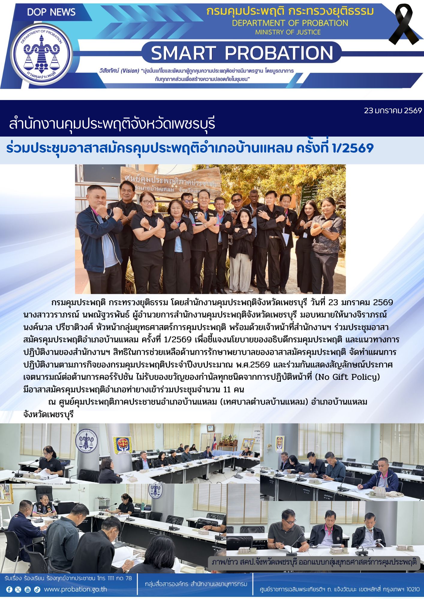 กรมคุมประพฤติ กระทรวงยุติธรรม โดยสำนักงานคุมประพฤติจังหวัดเพชรบุรี วันที่ 23 มกราคม 2569 นางสาววราภรณ์ นพณัฐวรพันธ์ ผู้อำนวยการสำนักงานคุมประพฤติจังหวัดเพชรบุรี มอบหมายให้นางจิราภรณ์ นงค์นวล ปรีชาติวงศ์ หัวหน้ากลุ่มยุทธศาสตร์การคุมประพฤติ พร้อมด้วยเจ้าหน้าที่สำนักงานฯ ร่วมประชุมอาสาสมัครคุมประพฤติอำเภอท่ายาง ครั้งที่ 1/2569 เพื่อชี้แจงนโยบายของอธิบดีกรมคุมประพฤติ และแนวทางการปฏิบัติงานของสำนักงานฯ สิทธิในการช่วยเหลือด้านการรักษาพยาบาลของอาสาสมัครคุมประพฤติ จัดทำแผนการปฏิบัติงานตามภารกิจของกรมคุมประพฤติประจำปีงบประมาณ พ.ศ.2569 และร่วมกันแสดงสัญลักษณ์ประกาศเจตนารมณ์ต่อต้านการคอร์รัปชัน ไม่รับของขวัญของกำนัลทุกชนิดจากการปฏิบัติหน้าที่ (No Gift Policy) มีอาสาสมัครคุมประพฤติอำเภอท่ายางเข้าร่วมประชุมจำนวน 11 คน